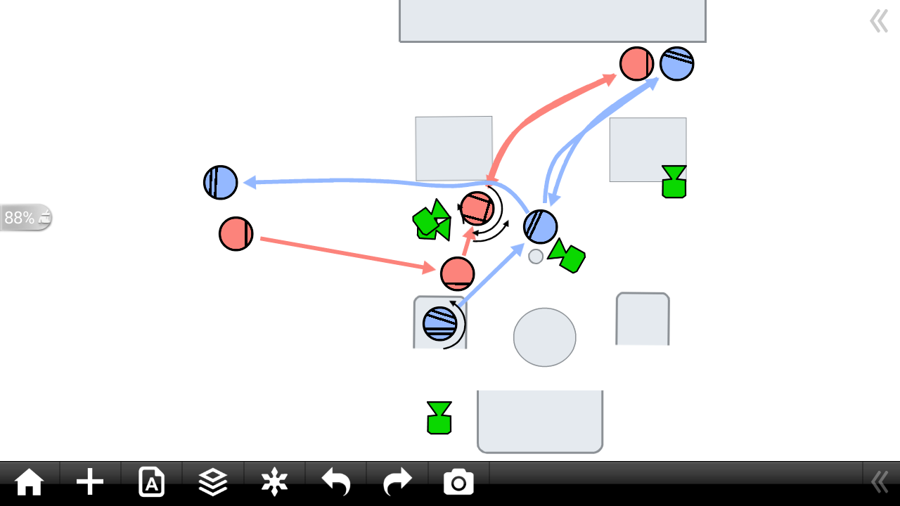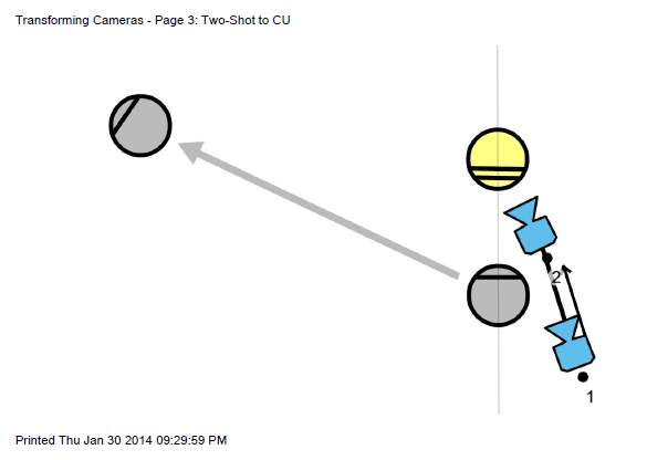 In this example a director of a project comes in to check on the status. All of the workers eventually end up talking to each other in the middle. We start with framing that shot and then figure out how we cover them building towards that shot. We eventually place cameras down to cover the scenes attempting to keep our setups as low as possible.